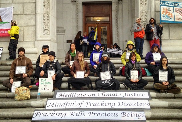 A group of 15 to 20 people from the the Buddhist Peace Fellowship, sitting on the steps of the state building meditating, amid banners that read, “Mindful of Fracking Disasters”—a direct appeal to Brown, who identifies as a Buddhist (photo: Brooke Anderson).