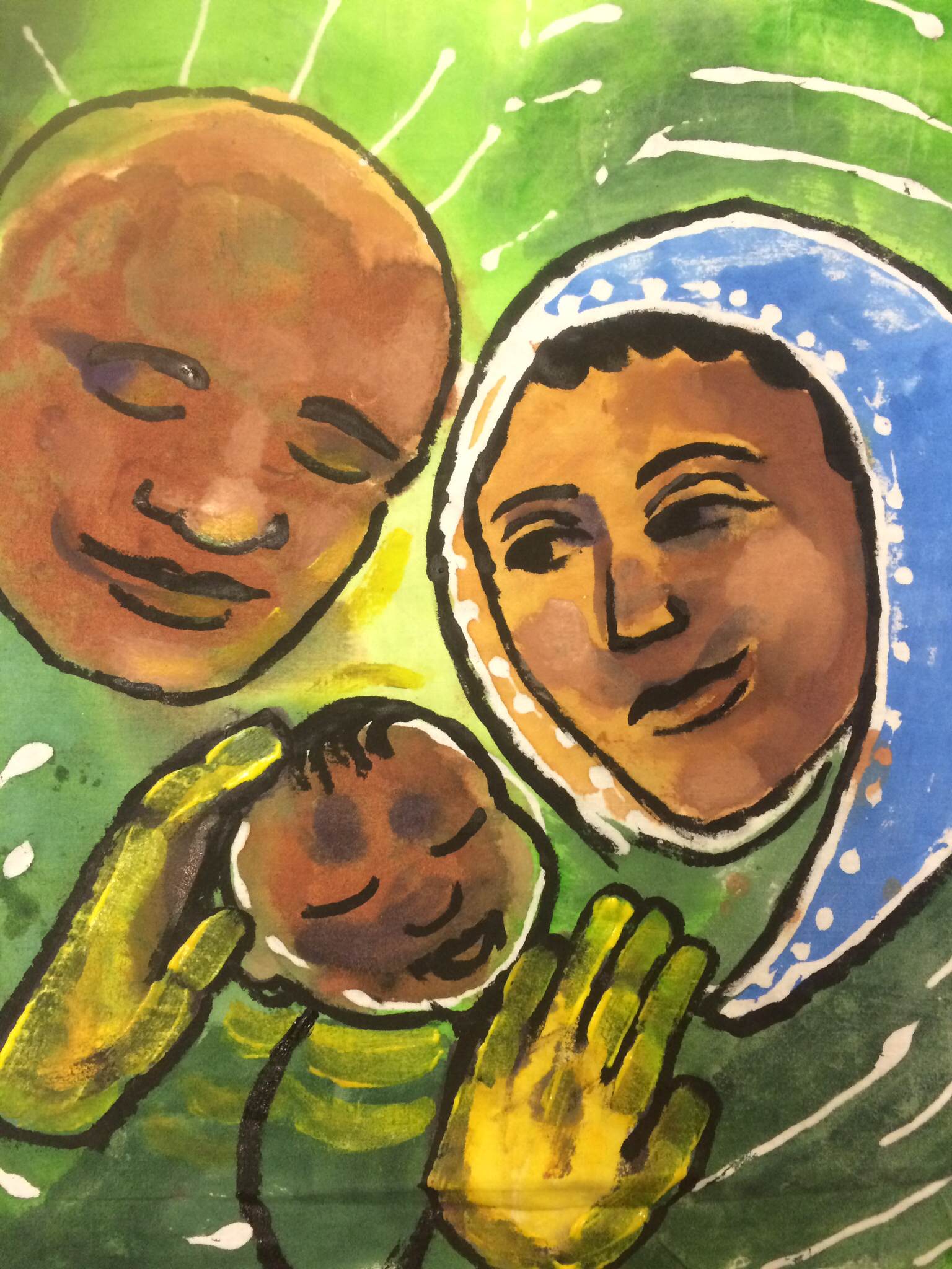 These are collaborative icons made by my coworker Helen Collins and I with Sunday School children at Redeemer Lutheran Church in North Minneapolis. We are using the Godly Play method of Sunday school, which involves storytelling and responding to stories through art as sacred practices. Our creative, lively multiracial church is housed in a hundred-year-old building full of stained-glass images of a blond white Jesus–but we as a congregation have many more ways of seeing our savior. To tell our Lent stories about Jesus’ life, we decided to make our own images that imagine Jesus in different ways. Helen and I used a glue batik to mark out basic shapes on fabric, children painted them with acrylic paint, and then we are adding black lines over the top to echo the stained glass. It is a work in progress that has already led to a lot of fun exploration.