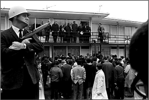 Such a reading places the church alongside all those at Mark’s Golgotha who wag their heads at the spectacle of the cross. (Right: Police and Civil Rights leaders gather at the scene of King’s assassination the day after. Photo by Bill Preston, The Tennessean.)
