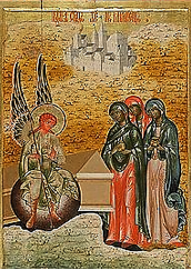 As noted, our three women have already appeared together at the execution of Jesus, holding vigil. There they are described with three loaded Markan phrases: they “followed;” “served” (again diakoneo); and “came up to Jerusalem” (15:41). Each verb articulates specific aspects of Jesus’ call to discipleship throughout the second half of the gospel narrative. In other words, these women are presented here at the close of the tale as true disciples. The androcentric narrative has completely collapsed, and women have stepped in to keep the discipleship story alive. (Right: Eastern Orthodox icon of the two Marys and Salome at the Tomb of Jesus, Kizhi, 18th century).
