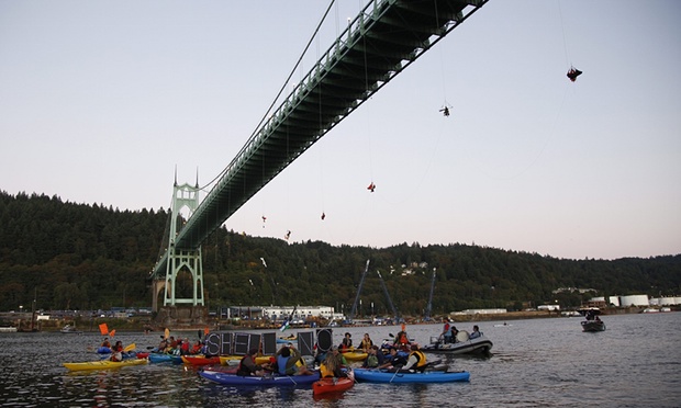 Then, around 3:00 in the afternoon, the police came out to the bridge and began to escort the anchors off. The anchors were the people that each climber had on the bridge to ensure their safety, who stayed there 24/7. They took them away, gave them very minor citations and released them. Then they started to force the climbers down. And in an incredible display of just absolute chaos, the police and the Coast Guard came, forced the climbers down and began to take them all away. And they only opened up—didn’t take all of them; they opened up an opening large enough for the Shell ship to come through. The ship started to come, and dozens and dozens of kayakers came and threw themselves in front of the ship. People jumped out of their kayaks to try to stop them. People were on inflatable pool toys. And it was absolute chaos. The Coast Guard ran over one of the kayakers. I mean, it was absolute mayhem.