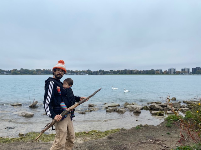 3pm: it’s a beautiful day out, so my partner says, let’s go to the water. We go to Belle Isle to look for driftwood for a Dia de Los Muertos altar that he’s making for our friend. He walks with the baby and I do my coaching calls on the Detroit River