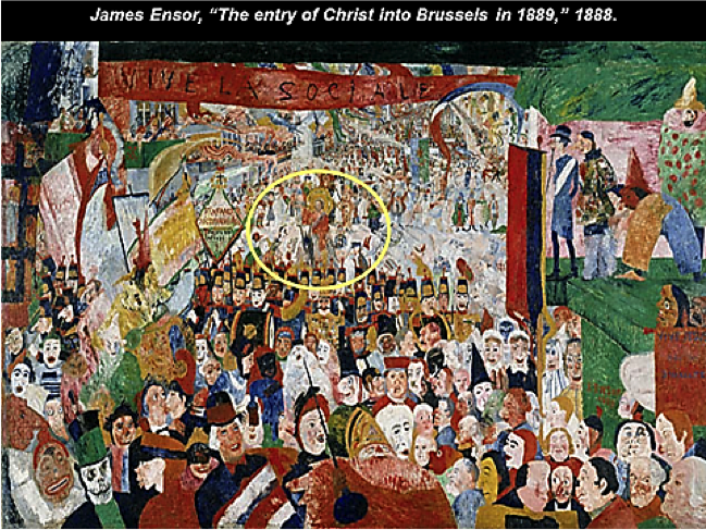 At right is one of my favorite posters, hanging in our office here at BCM. It is a painting by Belgian artist James Ensor that captures the political dynamism of the Palm Sunday march. “The Entry of Christ into Brussels in 1889” was painted (note carefully) in 1888. [2] Considered “a forerunner of 20th century Expressionism,” in its composition a vast carnival mob in grotesque masks advances toward the viewer: a sea of frauds, clowns, and caricatures of public, historical, and allegorical figures, including Belgian politicians and members of Ensor’s family. Nearly lost amid the teeming throng is the haloed Christ on his donkey (circled in yellow)—mostly ignored, a precarious, isolated visionary amidst the herd-like masses of modern society.