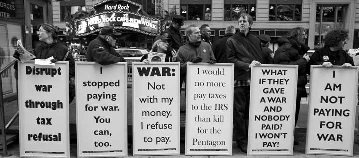 There are two key things to remember: First there’s nothing illegal about saying to the IRS, “I conscientiously do not believe in paying taxes for war, and I’m not going to do it. Here’s what I earned as income. Here’s what I’m paying as income tax, which is half of my calculated income tax, as required. This money that I am paying as income tax is not for war but rather for the other half of taxes that I hope goes into the good things that are done for people by governments rather than killing people. I’m going to use the half that I’m not paying specifically to help people and communities in need through the alternative funds that are set up by tax resisters.” The IRS may try to disagree with you, but there’s nothing illegal as long as you file your income tax, and are honest about what you earn.