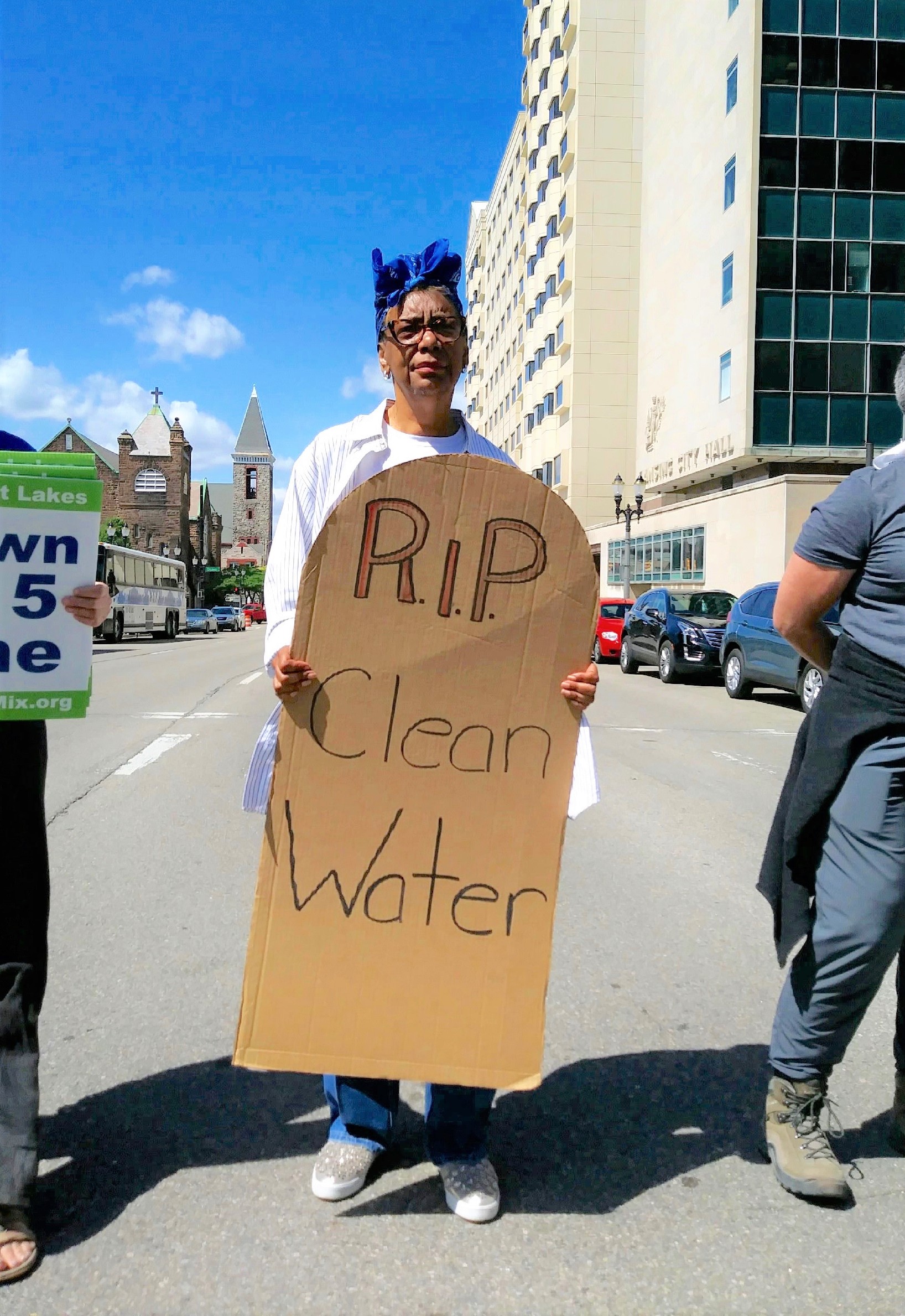 Five years before George Floyd got murdered, Flint, Michigan got poisoned. Black women from Flint drove down to a march for clean and affordable water in Detroit, where Lindsay and I were living. The citizen-activists they call “Flintstones,” Claire McClinton (photo above), Nakiya Wakes and others, brought with them bottles of brownish-yellow water from taps in their homes. They were not bearing witness to isolated incidents. It was a full-blown epidemic. It was all true: residents of Black-majority Flint were drinking water from their taps tainted with lead and other deadly bacteria. Complaints and cries for help were legion. An epidemic of Legionnaires disease erupted.