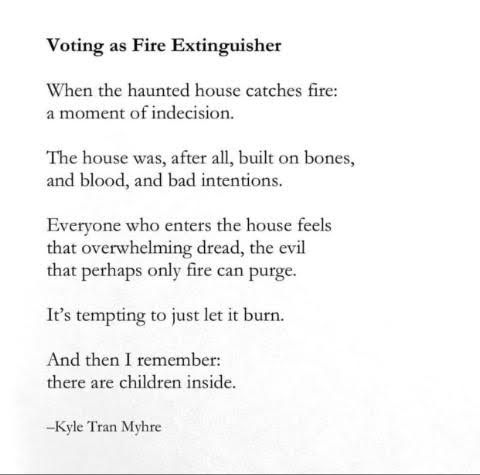 It’s Tempting to Just Let it Burn On November 8, 2022 By RadicalDiscipleshipIn Uncategorized A perfect poem for today, from Kyle Tran Myhre Share this: Click to share on X (Opens in new window) X Click to share on Facebook (Opens in new window) Facebook Like Loading... Related