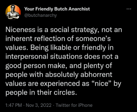 Niceness On November 10, 2022November 8, 2022 By RadicalDiscipleshipIn Feminist/Womanist/Queer Liberation and Theology, Subverting Empire A wise word from Your Friendly Butch Anarchist. Share this: Click to share on X (Opens in new window) X Click to share on Facebook (Opens in new window) Facebook Like Loading... Related