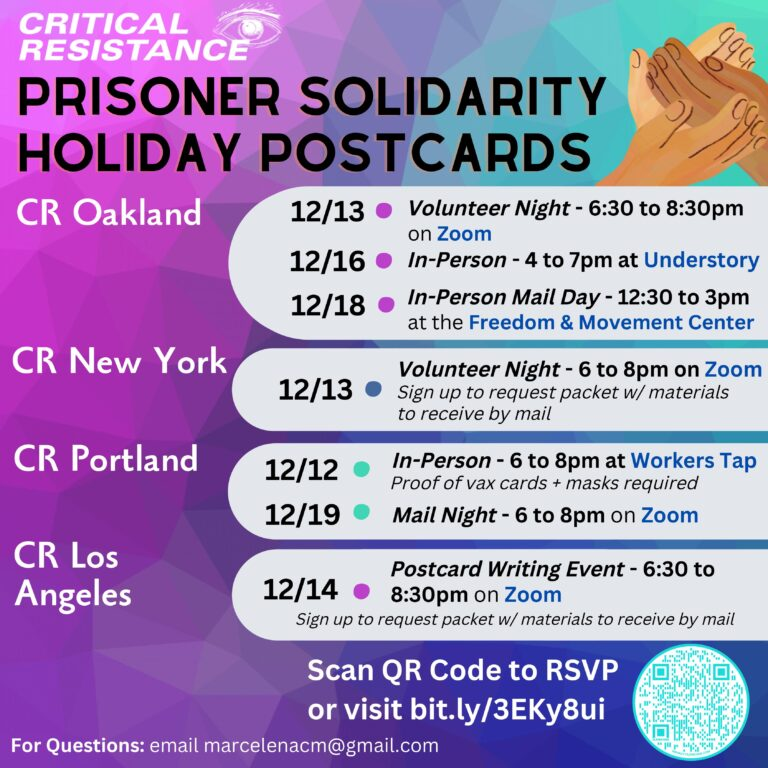 Each year, CR sends postcards to over 8,000 of our imprisoned comrades across the country as a way to send encouragement, strength, and solidarity to folks across prison walls and let them know we’re still out here fighting alongside them for PIC abolition. Please spread the word to support this lift FAR AND WIDE using the events flyer and RSVP Form!