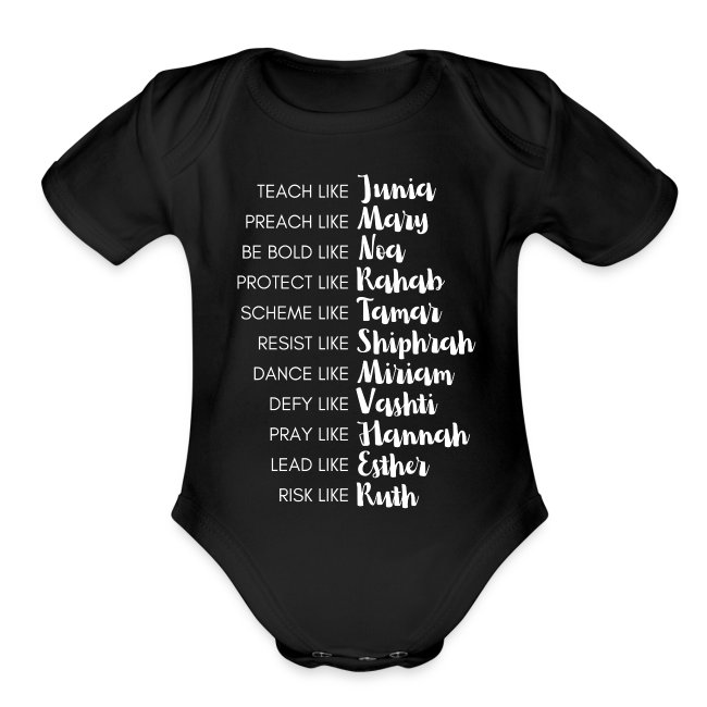 “I was on Etsy looking for fun clothing for babies, as millennial parents do, and found really terrible Christian T-shirts for girls [with phrases] like, ‘Wait like Hannah’ and ‘Serve like Martha. The only images that capitalism has for women [are] doing laundry and waiting around, and I thought that sucked.” – Rianna Isaak-Krauss