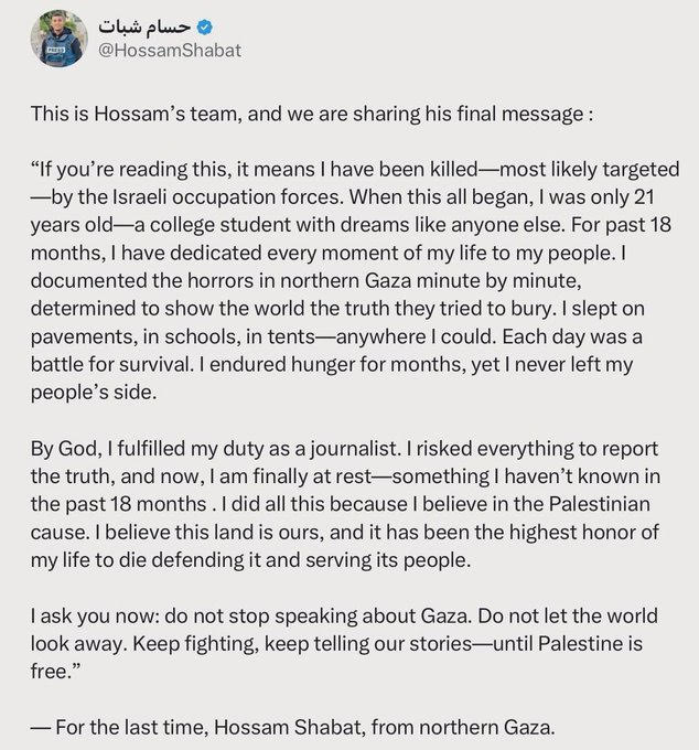 The Truth they Tried to Bury On March 26, 2025March 25, 2025 By RadicalDiscipleshipIn Subverting Empire From Hossam Shabat, who was murdered in Gaza a few days ago by the IOF. Share this: Click to share on X (Opens in new window) X Click to share on Facebook (Opens in new window) Facebook Like Loading... Related