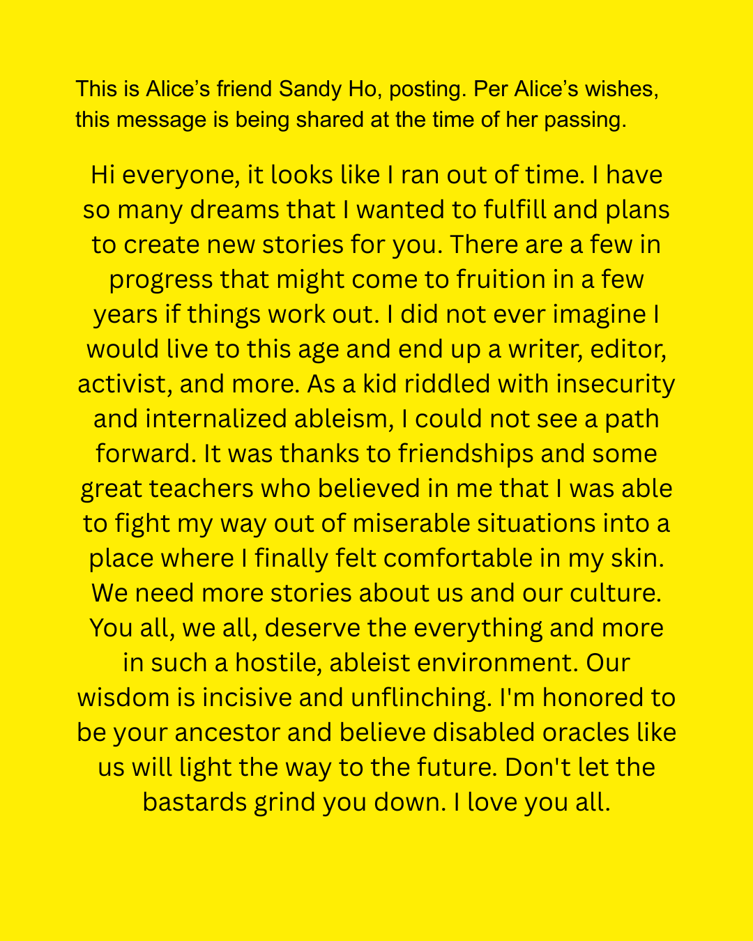 A final message from Alice Wong, the author of Disability Intimacy: Essays on Love, Care and Desire. This was posted on Twitter on November 15, 2025.
