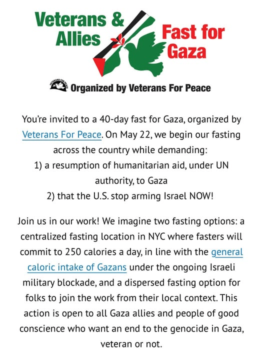 Register to join the 40-day fast for Gaza here. If you don’t have the capacity to fast for forty days, there is a great option to recruit a chain of fasters that last the 40 day action length. (For example, four people commit to 10 days spread across the action).